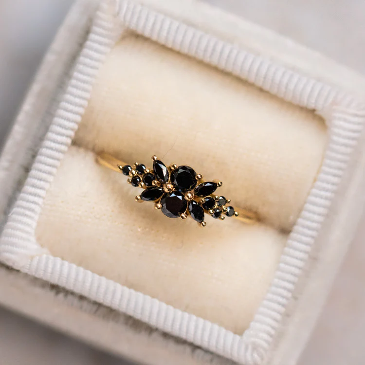 Dark and romantic, the Black Diamond Flora Engagement Ring from Artemer features a cluster of stunning black diamonds set in 18k solid yellow gold.