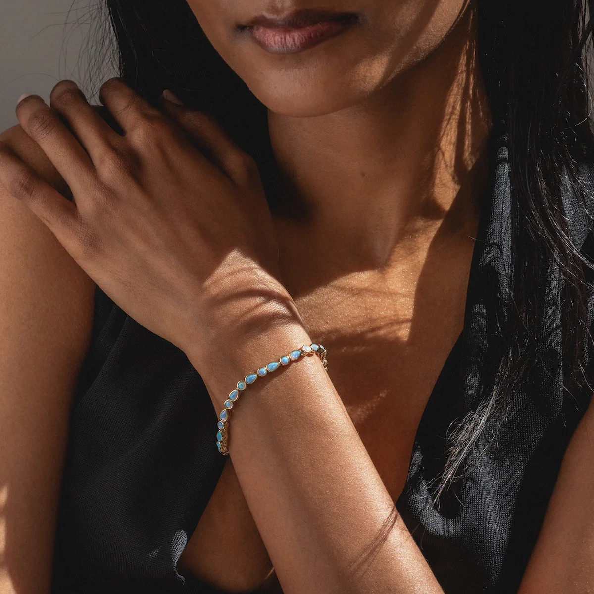 Glow for days with the Isla Tennis Bracelet by Melinda Maria. This stunningly luminescent bracelet features gorgeous simulated blue opals and is an essential accent piece for any bracelet combo.