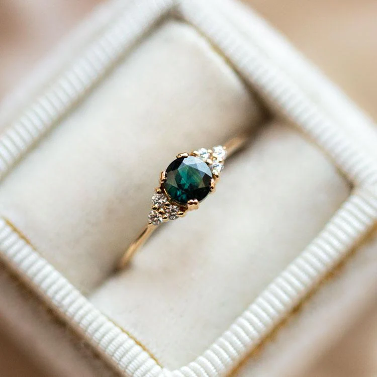 The Lune Ring features a tel sapphire celestial body orbited by a cluster of sparkling white brilliant cut diamonds. This stunning piece makes the ultimate alternative engagement ring, and it looks just as good on your right hand.