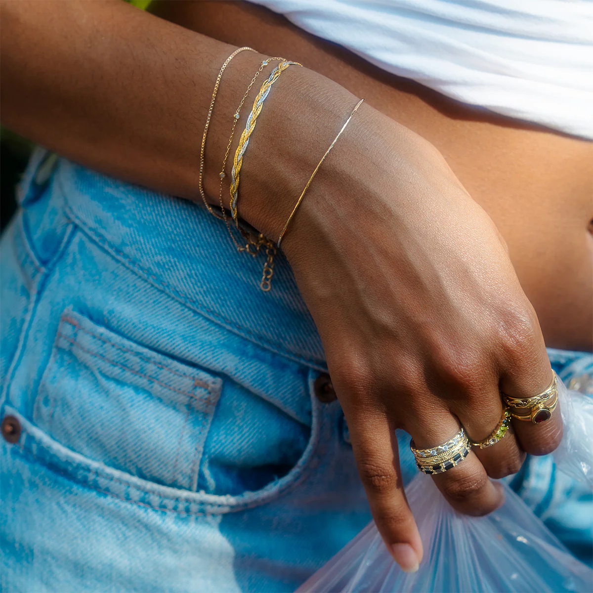 Our favorite way to do mixed metals. This solid gold bracelet features a braided herringbone chain design in white and yellow gold, and the amount of shimmer this beauty gives off in the sunlight is unlike anything else we've ever seen.