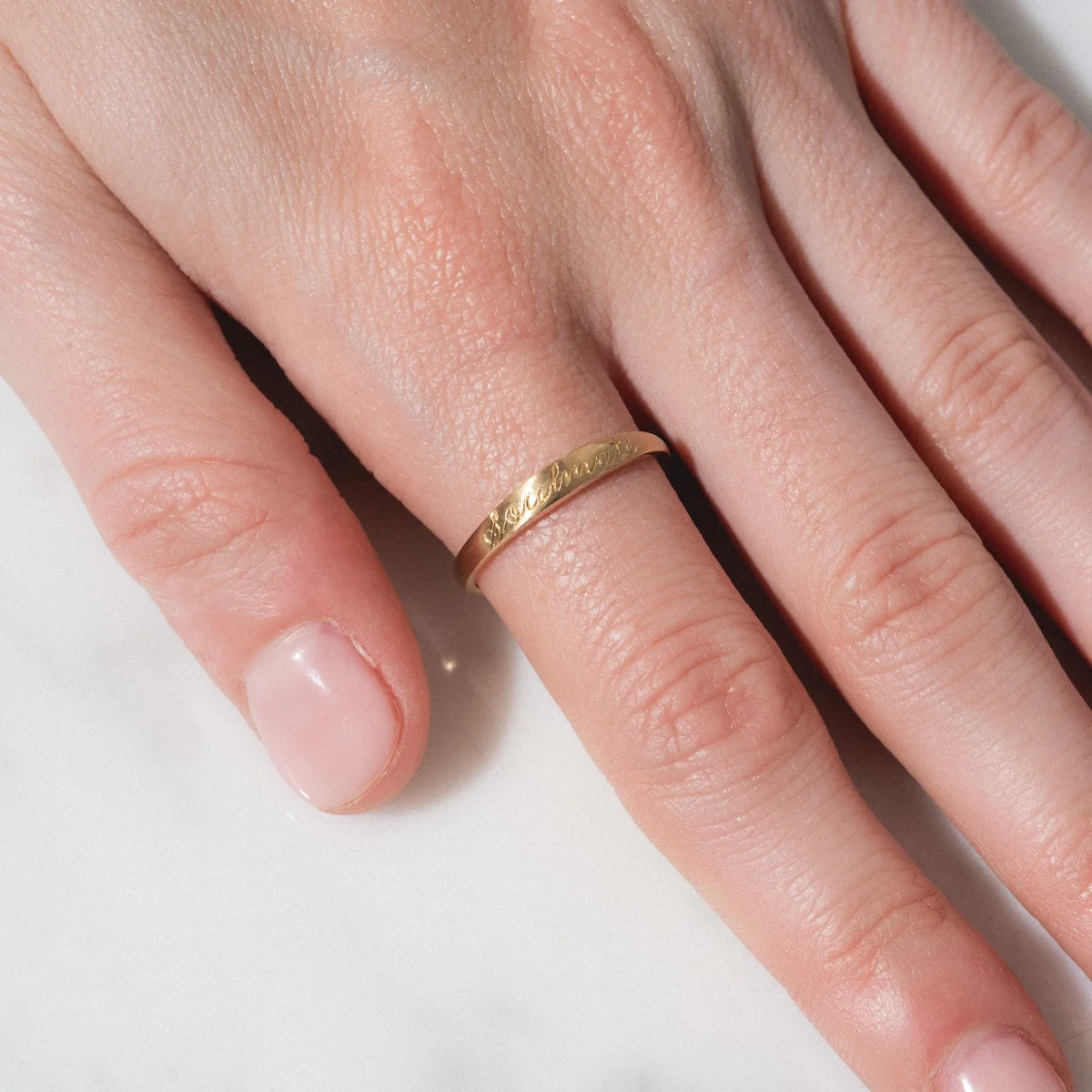 Celebrate eternal love with this gorgeously timeless band, a symbol crafted in solid yellow gold that is just as infinitely durable. Each delicate ring features a stunning soft matte finish and comes inscribed with the word "Soulmate" in a lovely cursive script.