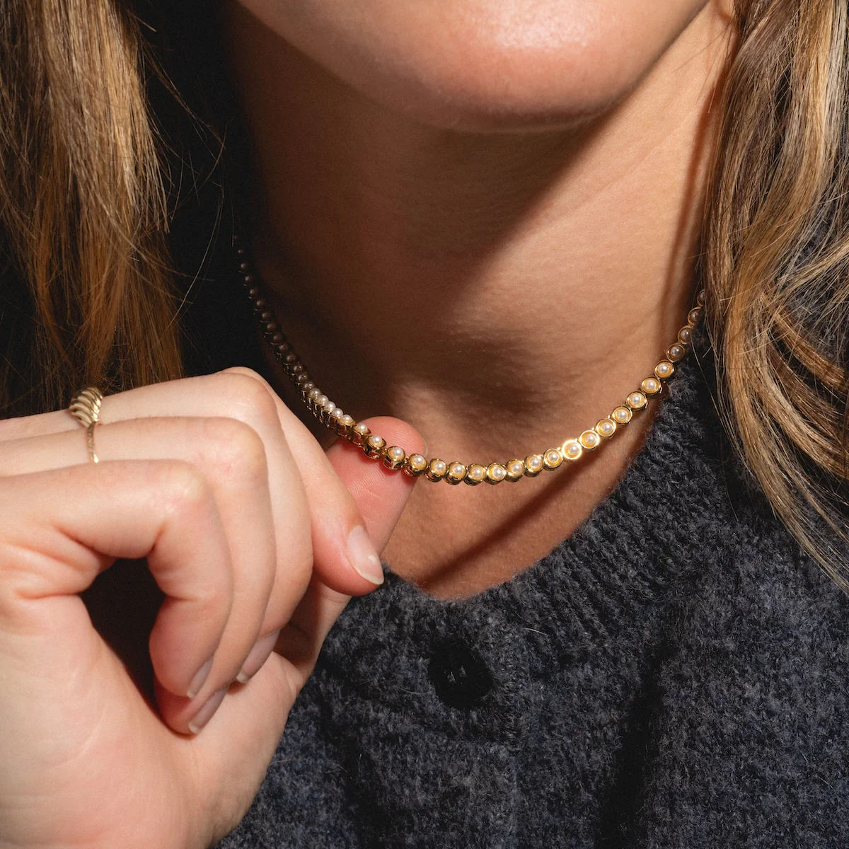 Not your typical pearl necklace - the Tennis Necklace in Pearl is a modern retelling of a classic pearl necklace in a much loved tennis style. It features delicate, beautifully opalescent pearls bezel set in yellow gold.